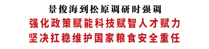 景俊海指出,吉林作为农业大省和国家重要商品粮基地,必须时刻牢记习近平总书记殷切嘱托,坚决扛起责任,充分发挥优势,大力推进“千亿斤粮食”生产工程,努力争当农业现代化排头兵,为维护国家粮食安全贡献力量。要着力保护好、利用好黑土地这一“耕地中的大熊猫”,落实最严格的耕地保护制度,加快实施西部盐碱地综合治理工程,有效夯实粮食生产根基。要着力强化科技支撑,持续优化科技服务,深入推进现代种业等关键技术攻关,全面提升农业生产信息化、数字化、智能化水平。要着力打通产业链条,积极发展种植、养殖、加工全产业链,促进农民就近就地就业,助力建成全国粮仓肉库、百姓中央厨房。要着力加强防灾减灾,抓好田间管理和病虫害监测防控,全力夺取今年粮食丰收。
