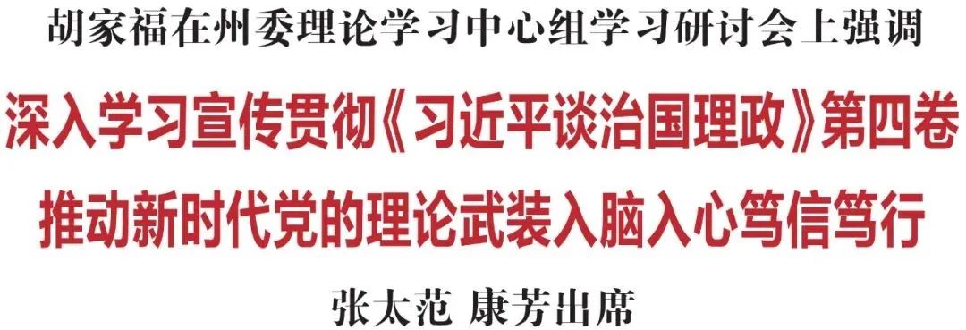 7月22日,州委理论学习中心组召开学习研讨会,集体学习《习近平谈治国理政》第四卷,开展交流研讨,省委常委、州委书记胡家福主持会议并讲话。他强调,要把深入学习宣传贯彻《习近平谈治国理政》第四卷作为重大政治任务,推动新时代党的理论武装入脑入心、笃信笃行,切实把学习成果转化为奋进新征程、建功新时代的工作举措和实际成效,以优异成绩迎接建州70周年大庆和党的二十大胜利召开。州人大常委会主任张太范、州政协主席康芳出席会议。