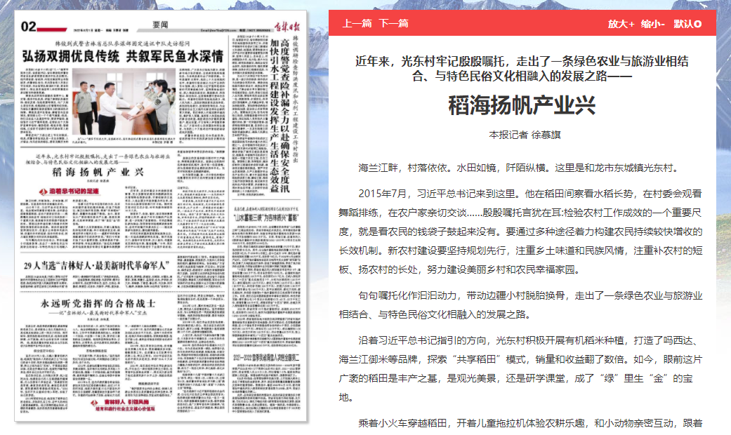 8月1日,吉林日报2版“沿着总书记的足迹”专栏刊发《近年来,光东村牢记殷殷嘱托,走出了一条绿色农业与旅游业相结合、与特色民俗文化相融入的发展之路——稻海扬帆产业兴》。