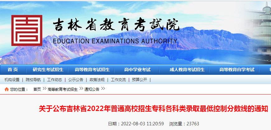 关于公布吉林省2022年普通高校招生专科各科类录取最低控制分数线的通知