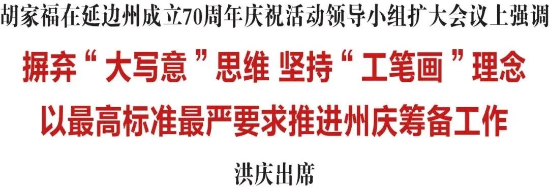 胡家福要求,要在会事活动筹备上再精细。高水平筹备好庆祝大会和表彰大会,突出铸牢中华民族共同体意识这一主题,精心设计活动方案和备选方案,做细做实彩排演练、会场布置等各项工作;高标准筹备好“图洽会”和延商大会,广泛联络对我州有投资意向、与我州有感情基础的企业家,邀请更多企业前来参加州庆活动、考察合作项目,真正促成一批重大项目落户延边;高质量筹备好民族团结进步展和北京成就展,精心打磨细节,创新展示形式,让各族人民在精彩纷呈的展陈中感受时代变迁、体验幸福生活、激发奋进力量。