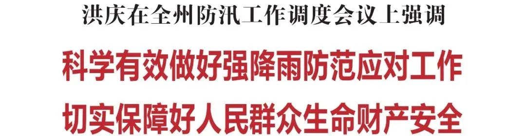 洪庆指出,各县市和相关部门要密切关注天气、雨情、汛情发展变化,加强科学研判,有针对性地进行安排部署。要盯紧水利枢纽安全,时刻关注水库水位情况,对重点水库、塘坝等要派专人值守,严防强降雨带来的洪涝和其他次生灾害发生。要做好地质灾害监测预警和应急处置等各项防灾工作,紧盯重点部位和重点人群,加强地质灾害隐患点巡查检查,及时疏散隐患点附近群众,严防地质灾害及人员伤亡。
