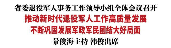 8月16日,省委书记、省委退役军人事务工作领导小组组长景俊海主持召开省委退役军人事务工作领导小组全体会议,深入贯彻习近平总书记关于退役军人工作重要论述,总结工作、分析形势、部署任务,加快推动新时代退役军人工作高质量发展,不断巩固发展军政军民团结大好局面,以实际行动迎接党的二十大胜利召开。省长、省委退役军人事务工作领导小组组长韩俊出席会议。