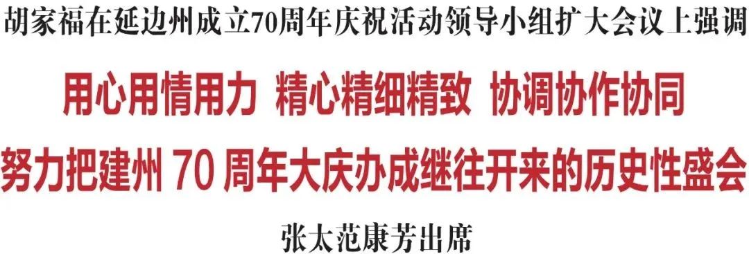 胡家福指出,建州70周年大庆,不仅是展示全州发展成果、提升对外形象的重要平台,更是争取各方支持、助推重大项目建设的难得历史机遇。要抓住机遇、珍惜机遇、用好机遇,突出抓好延吉机场迁建、沿边旅游大通道、多维集团生物制药、国家级区域医疗中心、吉大附中延边校区等重大项目,想尽一切办法、调动一切力量,办成一些过去我们想办而没有办成的大事,解决一些过去我们想解决而没有解决的难题,努力把不可能变为可能,为建州70周年大庆增添浓墨重彩的一笔,让全州人民感受到延边未来发展的蓬勃生机。