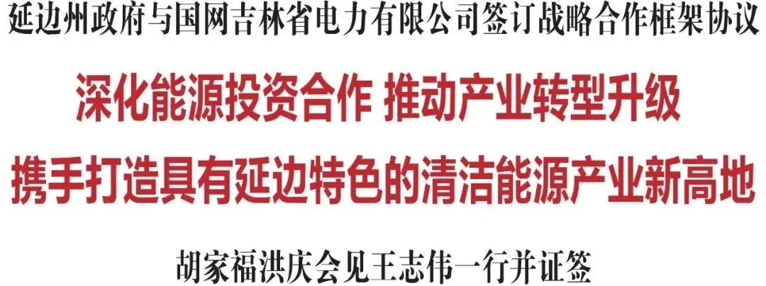 9月13日,省委常委、州委书记胡家福,州委副书记、州长洪庆在延吉会见了国网吉林省电力有限公司董事长王志伟一行,共同见证延边州政府与国网吉林省电力有限公司签订战略合作框架协议。
