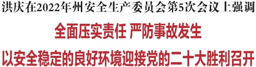 洪庆指出,临近国庆和党的二十大,安全生产工作形势紧、要求高、任务重。各县市、各部门要深刻认识当前安全生产面临的诸多不利因素和复杂严峻形势,不折不扣贯彻落实国务院安全生产“15条”硬举措要求,坚决防范安全生产事故发生,确保国庆及党的二十大召开期间全州安全稳定。