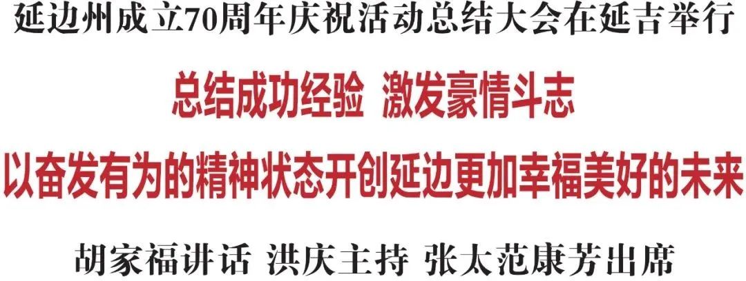 9月30日,延边州成立70周年庆祝活动总结大会在延吉举行。会议总结建州70周年大庆经验,表彰先进集体和先进个人,动员和激励全州各族干部群众积极投身延边振兴发展大业,以党和人民满意的新业绩迎接党的二十大胜利召开。省委常委、州委书记胡家福出席并讲话。州委副书记、州长洪庆主持大会,州人大常委会主任张太范、州政协主席康芳出席会议。