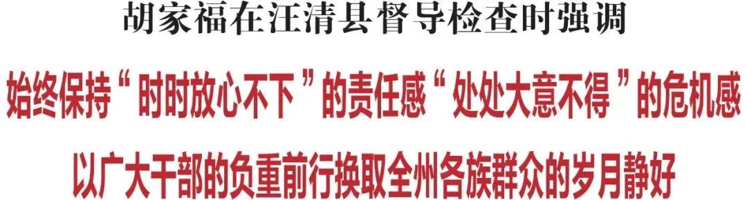 胡家福高度关注节日期间安全生产工作。他先后来到汪清解氏工艺公司、庙岭北方水泥厂,走进企业生产车间、总控中心,详细了解企业安全生产责任制落实、应急防范措施、节日值班值守等情况,叮嘱企业要严格落实安全生产主体责任,严格规范操作流程,深入排查安全隐患,加强节日值班值守,切实做到安全责任到位、安全培训到位、安全管理到位、应急保障到位,确保企业生产安全有序。调研中,胡家福强调,当前正值国庆假期,党的二十大召开在即。越是特殊时期、关键时候,越要扛起责任、体现担当。全州各级党委、政府要坚持问题导向,强化底线思维,始终保持“时时放心不下”的责任感、“处处大意不得”的危机感,扎扎实实做好防风险、保安全、护稳定各项工作。要时刻绷紧安全生产这根弦,紧盯道路交通、建筑施工、消防、燃气等重点领域,深入推进安全大检查、隐患大整治,切实做到安全要素全部在控、安全风险有力管控,坚决防止发生重特大安全事故。要抓紧抓实疫情防控各项措施,严密细致做好重点地区、重点行业、重点人群排查管控,坚决守住不发生规模性疫情底线。要用心抓好矛盾纠纷排查化解,努力把矛盾化解在基层、把问题解决在萌芽状态,为党的二十大胜利召开营造安全稳定、国泰民安的社会政治环境。