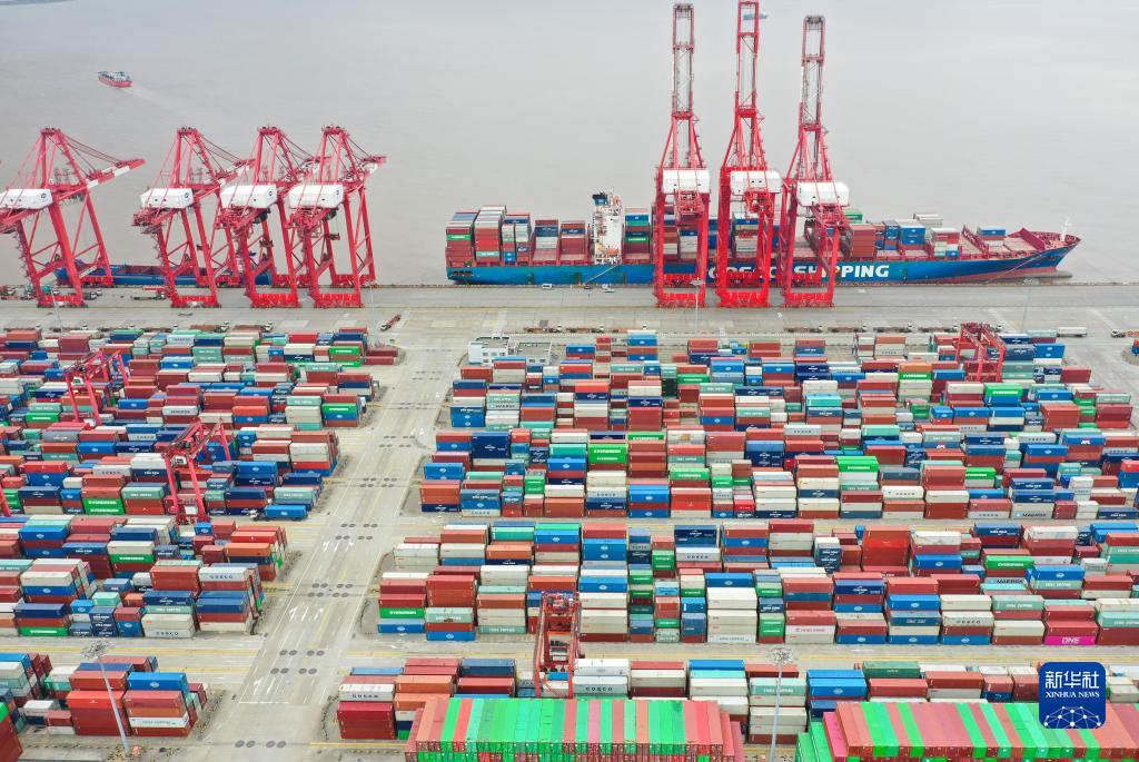 上海洋山港集装箱码头(2022年4月15日摄,无人机照片)。新华社记者 丁汀 摄