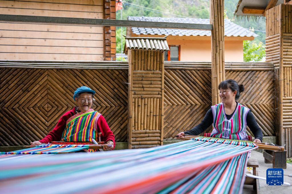 在云南省贡山独龙族怒族自治县独龙江乡迪政当村,独龙族老人李文仕(左)和女儿在编织独龙毯(2022年5月10日摄)。新华社记者 曹梦瑶 摄
