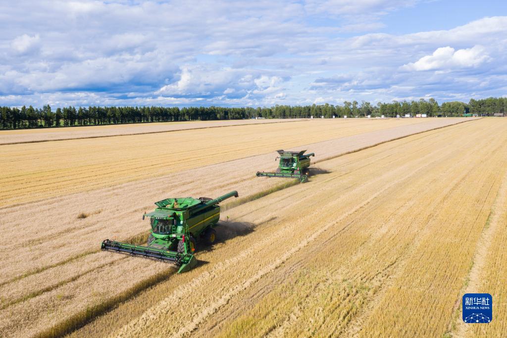 黑龙江北大荒,一台台收割机车往来穿梭,丰收的画卷在这片黑土地铺展开来。