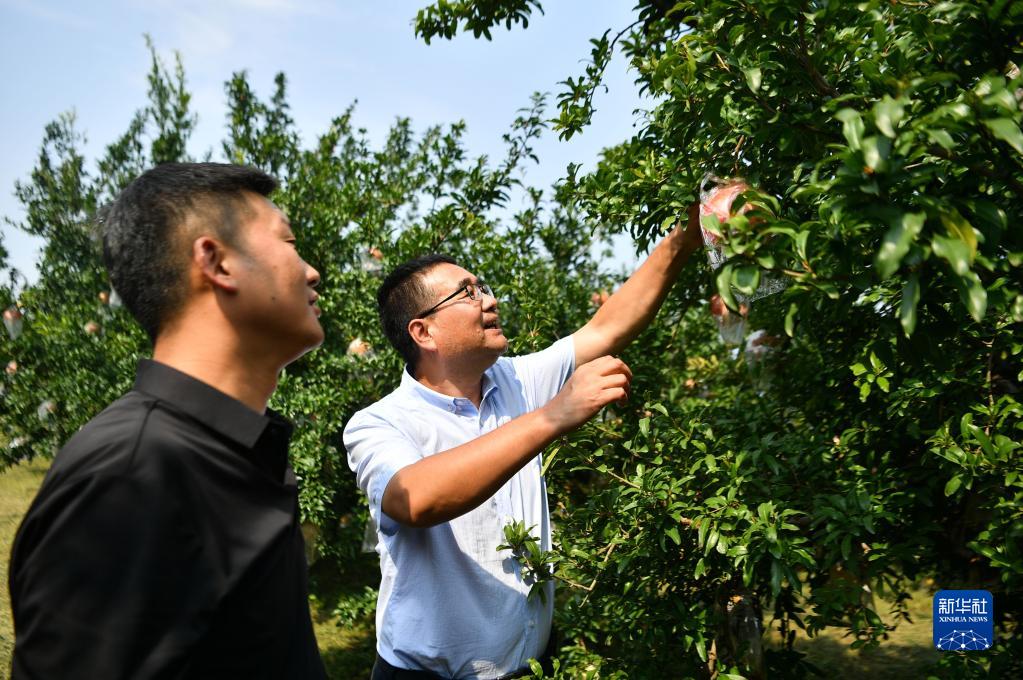 陕西省西安市临潼区园艺工作站工作人员(右)与当地石榴种植大户交流果品长势(2022年9月26日摄)。新华社记者 张博文 摄
