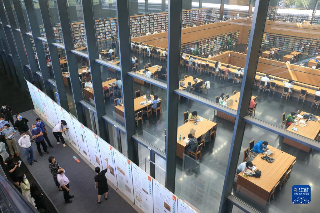 在北京国家图书馆,工作人员介绍“经典,予生活以诗意——‘文津经典诵读’十周年主题展”(2022年9月7日摄)。新华社记者 殷刚 摄