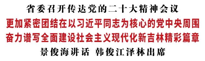10月24日,省委以视频形式召开传达党的二十大精神会议。省委书记景俊海主持会议并讲话。他强调,要更加紧密团结在以习近平同志为核心的党中央周围,学习好、领会好、贯彻好党的二十大精神,自信自强、守正创新,踔厉奋发、勇毅前行,奋力谱写全面建设社会主义现代化新吉林精彩篇章。省委副书记、省长韩俊,省政协主席江泽林出席会议。