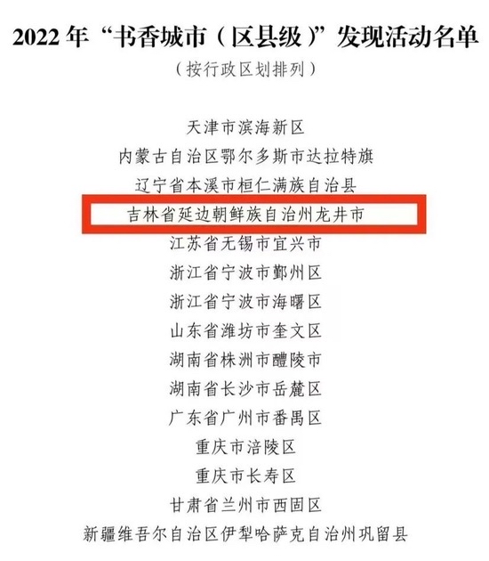 日前,中国图书馆学会发布了2022年“书香城市(区县级)”发现活动名单,我省龙井市成功入选,成为全国15个入选城市之一。