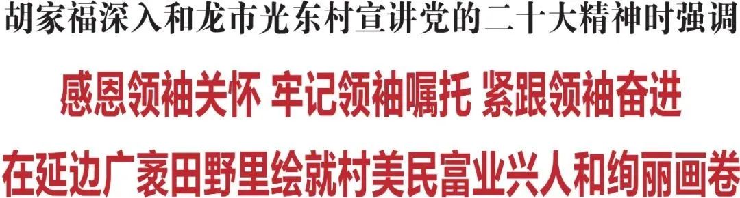 调研中,胡家福在光东村村委会主持召开座谈会,与党员群众代表分享学习党的二十大精神的体会、感悟和收获,用朴实接地气的语言,深入阐述了党的二十大的重大意义、丰富内涵、精神实质。他指出,党的二十大是在全党全国各族人民迈上全面建设社会主义现代化国家新征程、向第二个百年奋斗目标进军的关键时刻召开的一次十分重要的大会,是一次高举旗帜、凝聚力量、团结奋进的大会。习近平总书记所作的报告,深刻阐释了新时代坚持和发展中国特色社会主义的一系列重大理论和实践问题,描绘了全面建设社会主义现代化国家、全面推进中华民族伟大复兴的宏伟蓝图,为新时代新征程党和国家事业发展、实现第二个百年奋斗目标指明了前进方向、确立了行动指南。党的二十届一中全会选举产生了以习近平同志为核心的新一届中央领导机构,充分体现了9600多万党员和14亿多中国人民的共同意志,是党之大幸、国之大幸、民之大幸。我们要深刻领悟“两个确立”的决定性意义,牢牢把握过去五年工作和新时代十年伟大变革的重大意义,牢牢把握习近平新时代中国特色社会主义思想的世界观和方法论,牢牢把握以中国式现代化推进中华民族伟大复兴的使命任务,牢牢把握以伟大自我革命引领伟大社会革命的重要要求,牢牢把握团结奋斗的时代要求,切实做到悟于心、践于行、落于实。