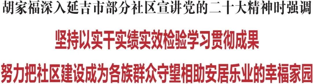 11月1日,省委常委、州委书记胡家福深入延吉市部分社区宣讲党的二十大精神,并就基层治理、基层党建及社区网格化管理等工作进行调研。他强调,要深入落实《中共中央关于认真学习宣传贯彻党的二十大精神的决定》,全面学习、全面把握、全面落实党的二十大精神,以实干实绩实效检验学习贯彻成果,努力把社区建设成为各族群众守望相助、安居乐业的幸福家园。