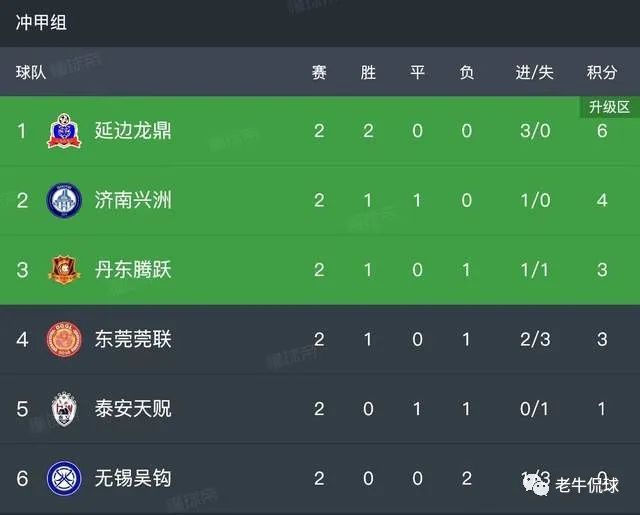 总结胜利是为了更好地展望未来。前两轮战罢,冲甲组积分榜的排序分别是:第一名延边龙鼎(积6分),第二名济南兴洲(积4分),第三名丹东腾跃(积3分),第四名东莞莞联(积3分),第五名泰安天贶(积1分),第六名无锡吴钩(积0分)。