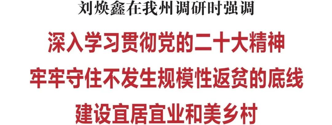 11月21日,中央农办副主任、国家乡村振兴局局长刘焕鑫到我州,调研巩固拓展脱贫攻坚成果和推进乡村振兴工作。刘焕鑫强调,要深入学习贯彻党的二十大精神,贯彻落实习近平总书记在陕西延安和河南安阳考察时的重要讲话精神,持续巩固拓展脱贫攻坚成果,牢牢守住不发生规模性返贫的底线,建设宜居宜业和美乡村,不断开创乡村振兴工作新局面。副省长韩福春一同调研。
