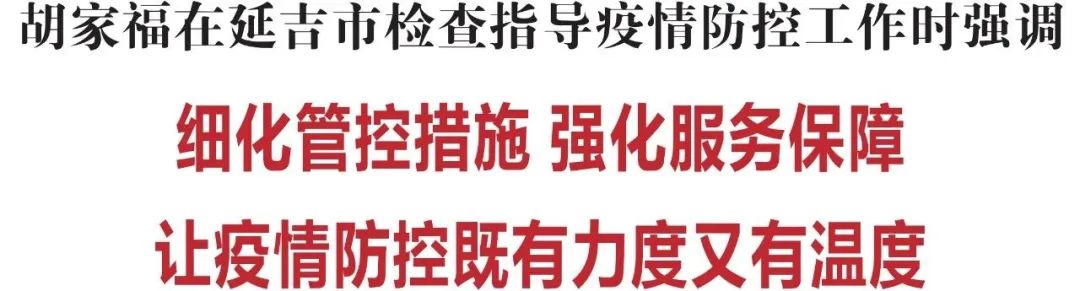 调研期间,胡家福主持召开座谈会,听取延吉市疫情防控工作汇报,研究解决具体问题。他强调,要牢固树立系统观念和极限思维,严格落实党中央新冠肺炎疫情防控要求,坚持“三个坚定不移”不动摇,在筑牢疫情防线和维护正常生产生活秩序之间找到最佳平衡点,努力以最短时间、最小代价打赢疫情防控歼灭战。要坚决果断决策,紧盯疫情态势和病毒传播特征,及时对防控措施进行优化和调整,综合用好各种防控措施,尽快控制传染源、斩断传播链。要坚持以快制快,严格落实“四应四尽”、日清日结要求,做到核酸检测上应筛尽筛快筛,隔离转运上应隔尽隔快隔,患者救治上应治尽治快治,封控管理上应封尽封快封,环境消杀上应杀尽杀快杀,确保快而有序、快而有效。要按照“两不停、三不断”的要求,坚持企业不停产、物流不停运,有效保障城市整体运行不断、群众基本生产生活不断、重点企业重点项目生产建设不断,着力加强学校、养老院、护理院、儿童福利院等重点场所疫情防控工作,统筹抓好疫情防控和民生保障,确保防疫抗疫既有力度又有温度,最大程度保护人民生命安全和身体健康,最大限度减少疫情对经济社会发展的影响。