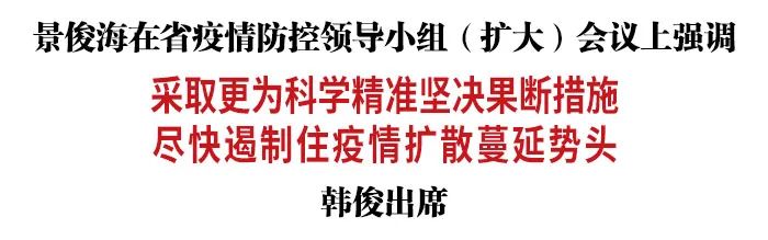 韩俊强调,当前,疫情形势愈加严峻复杂,全省上下必须把做好疫情防控工作作为头等大事,紧张起来、行动起来,科学研判疫情形势,根据疫情走势和病毒特点,采取坚决果断措施,以快制快,坚决遏制住疫情扩散蔓延势头。要提高核酸检测流调质效,统筹隔离资源,做好密接人员和高风险区溢出人员隔离工作。科学划定高风险区域,做好高风险区封闭和社会面管控工作,迅速切断疫情传播链条,尽快将疫情围住、捞干、扑灭。强化学校、工地、批发市场、监所、养老院等重点场所、重点人群管控。要压实各方责任,提级管理,第一时间落实防疫要求、反馈落实效果,加大督查检查力度,形成工作闭环。要做好防疫物资、生活物资、隔离场所、信息发布等工作,保障群众基本生活和就医需求。要高效统筹疫情防控和经济社会发展,强化要素供给,全力保通保畅,千方百计保障重点企业正常运行,确保重要产业链供应链稳定,确保冬季施工项目不停工,尽最大努力把疫情对经济社会发展的影响降低到最低程度。