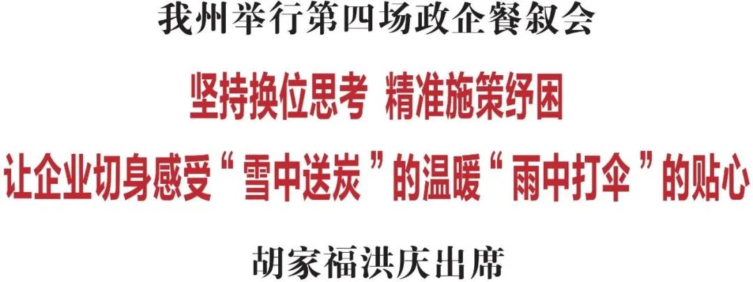 胡家福强调,企业兴则经济兴,企业稳则发展稳,服务企业发展是我们义不容辞的责任。全州各级各部门要深入学习贯彻党的二十大精神,坚持“无事不扰、随叫随到”,真心实意当好“店小二”,以更大力度、更实举措支持企业发展壮大,提供更多雪中送炭的帮助、添砖加瓦的扶持、精准有效的服务,为全州经济发展积蓄力量、增添后劲。要常态化深入企业生产一线,现场了解企业实际困难,深切感受企业困难所在、发展所需,切实做到共性问题集中解决、个性问题分类解决,真正“帮”到点子上、“服”到关键处。要积极帮助企业破解发展瓶颈,支持企业开展技术创新和管理创新,促进企业放开手脚、加快发展。要及时足额兑现惠企政策,不断加大对各类市场主体特别是中小微企业、个体工商户的支持力度,让企业切身感受到“雪中送炭”的温暖、“雨中打伞”的贴心。