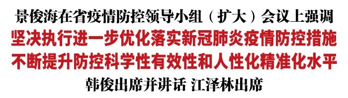 12月8日,省委书记景俊海以视频形式主持召开省疫情防控领导小组(扩大)会议,深入贯彻习近平总书记关于高效统筹疫情防控和经济社会发展的重要讲话重要指示精神,集中学习国务院联防联控机制综合组发布的《关于进一步优化落实新冠肺炎疫情防控措施的通知》,研究部署我省贯彻落实具体举措。景俊海强调,要认真落实习近平总书记重要讲话重要指示精神,坚持以人民为中心,始终把人民群众生命安全和身体健康放在第一位,坚决执行进一步优化落实新冠肺炎疫情防控措施,不断提升防控科学性、有效性和人性化、精准化水平。省委副书记、省长韩俊出席会议并讲话。省政协主席江泽林出席会议。