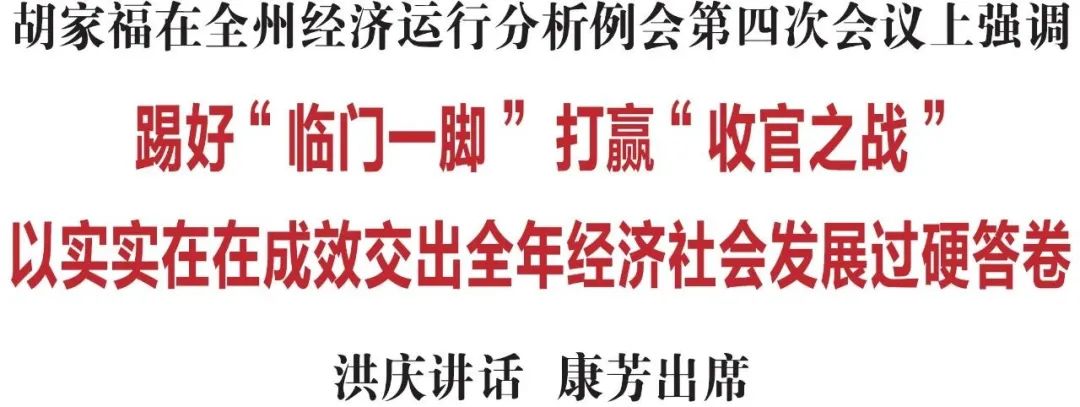 12月9日,省委常委、州委书记胡家福主持召开全州经济运行分析例会。他强调,全州上下要深入学习贯彻党的二十大精神,进一步增强抓好经济工作的政治责任感和工作紧迫感,拧紧发条、铆足干劲,踢好“临门一脚”,打赢“收官之战”,以实实在在的成效交出全年经济社会发展过硬答卷。州委副书记、州长洪庆出席会议并讲话,州政协主席康芳出席会议。
