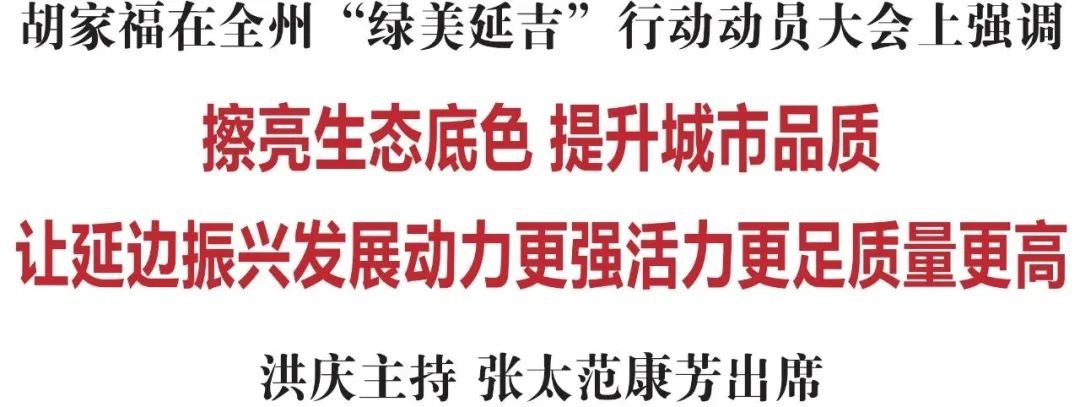 胡家福指出,党的十八大以来,以习近平同志为核心的党中央高度重视生态文明建设,将生态文明建设纳入“五位一体”总体布局,鲜明提出建设“美丽中国”的宏伟目标。习近平总书记围绕生态文明建设作出了一系列重要论述,为我们进一步推动生态文明建设指明了前进方向、提供了根本遵循。良好的自然生态环境,是我州的最大优势、最宝贵财富;建设绿美和谐的幸福家园,反映了全州人民的共同心愿,凝聚着各族群众的热切期盼。开展“绿美延吉”行动,是贯彻落实习近平生态文明思想的生动实践,是展示首府风采、提升延边美誉度影响力的重要载体,是优化营商环境、提升全州发展软实力的重大举措,是改善人居环境、提升延边各族群众生活品质的必然选择,具有重大的现实意义和深远的历史意义。各县市、州直有关部门要坚持从政治高度统一思想、从全局高度审视工作,真正把思想和行动统一到州委、州政府的决策部署上来,以“等不起”的紧迫感、“坐不住”的责任感,精心组织实施,高效有序推进。要压实主体责任,延吉市作为“绿美延吉”行动实施主体,要细化明晰目标任务、责任分工、保障措施和完成时限,倒排工期、挂图作战,确保按时高质量完成工作任务。要坚持州市一体,州直有关部门要在资金、立项、设计、建设、管护等方面重点倾斜,为“绿美延吉”行动顺利实施提供有力保障。要强化县市联动,各县市要牢固树立全州“一盘棋”思想,躬身入局、积极参与“绿美延吉”行动,形成整体推进的强大合力。