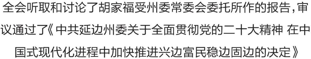 全会坚持以习近平新时代中国特色社会主义思想为指导,深入贯彻党的二十大精神和省委十二届二次全会精神,听取和讨论了胡家福受州委常委会委托所作的工作报告,审议通过了《中共延边州委关于全面贯彻党的二十大精神 在中国式现代化进程中加快推进兴边富民稳边固边的决定》。胡家福就《决定(讨论稿)》向全会作了说明。