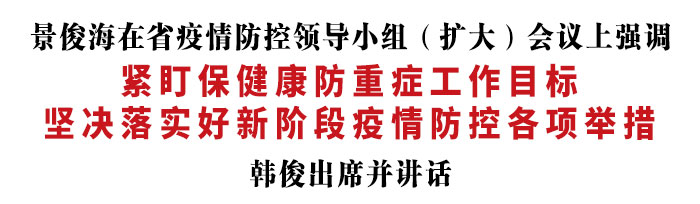 景俊海指出,当前,我省疫情防控进入新阶段,各级党委政府必须完整、全面、准确把握和执行党中央确定的防控政策,因时因势、因地制宜、与时俱进开展防控工作,不断提升防控科学性、有效性和人性化、精准化水平,做到尽量延峰、有效削峰、平稳渡峰,防止医疗资源挤兑。一要着力提升医疗救治水平,尽快扩充发热门诊资源,加快完善分级分类诊疗机制,加强医疗资源储备投放,有力动员和科学配置医护力量,有效应对疫情,确保平稳转段。二要着力满足群众用药需求,对空巢家庭、失独家庭、低收入家庭等特殊群体要做好兜底保障;全力保障医药企业满负荷生产,进一步提高终端配送效率,依法严厉打击囤积居奇等扰乱市场行为,切实维护药品市场价格稳定。三要着力推进重点人群防护和救治,建立社区与专门医疗机构对接机制,畅通紧急情况救治和转诊渠道,确保老年人、孕产妇、儿童、慢性基础性疾病患者等重点人群得到及时有效救治;加快推进老年人疫苗接种,持续提高接种覆盖率。四要着力抓好重点部位疫情防控,乡镇卫生院发热诊室要应设尽设、应开尽开,村卫生室要做好开药和随诊服务;生产企业、农贸市场、商场超市等人员聚集场所要常态化开展预防性消毒,引导顾客规范佩戴口罩;优先保障养老机构就医用药需求,严防发生大规模感染;认真实施春运疫情防控指南,保障口罩、防护服、消毒用品等防疫物资供应。五要着力加强宣传引导,教育引导群众做好自身健康第一责任人,科学有效保护自己和家人。