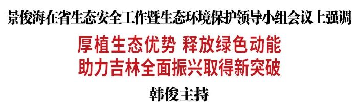 景俊海指出,加强生态环境保护和维护生态安全,是事关高质量发展的战略任务、事关吉林全面振兴的重大任务。一要全面加快吉林绿色低碳转型发展,深入实施“一主六双”高质量发展战略,扎实推进产业绿色化,培育壮大清洁能源产业,全面发展生态旅游,打造极具竞争力和可持续性的绿色大产业,切实把生态优势转化为发展优势。二要深入打好蓝天、碧水、净土保卫战,进一步巩固大气治理成果,提升水环境治理质量,加强土壤污染源头防控。三要高标准抓好生态系统保护修复重大工程,加快推进“大水网”、万里绿水长廊、林草湿生态连通等重大项目,深入开展第三个“十年绿美吉林”行动,有效筑牢生态安全屏障。四要着力健全生态环境治理体系,持续深化生态文明体制改革,加快完善绿色发展政策法规体系,统筹推进生态示范创建,抓好东北虎豹国家公园、松嫩鹤乡国家公园建设管理,依靠法治、依靠制度保护生态环境。
