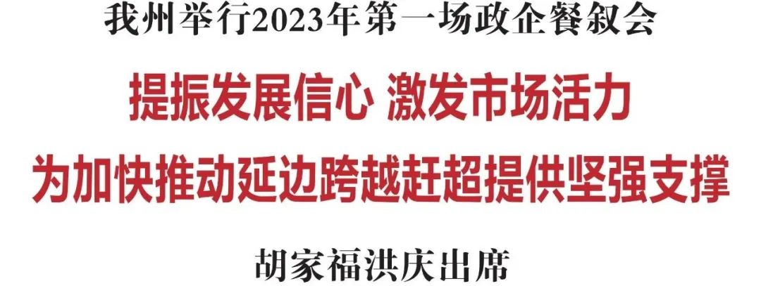 1月6日,延边州2023年第一场政企餐叙会在延吉举行。省委常委、州委书记胡家福,州委副书记、州长洪庆与8名企业家齐聚一堂、围坐交流,倾听企业意见建议,回应企业发展诉求,向广大企业传递州委、州政府与大家同担风雨、携手并进的信心决心。
