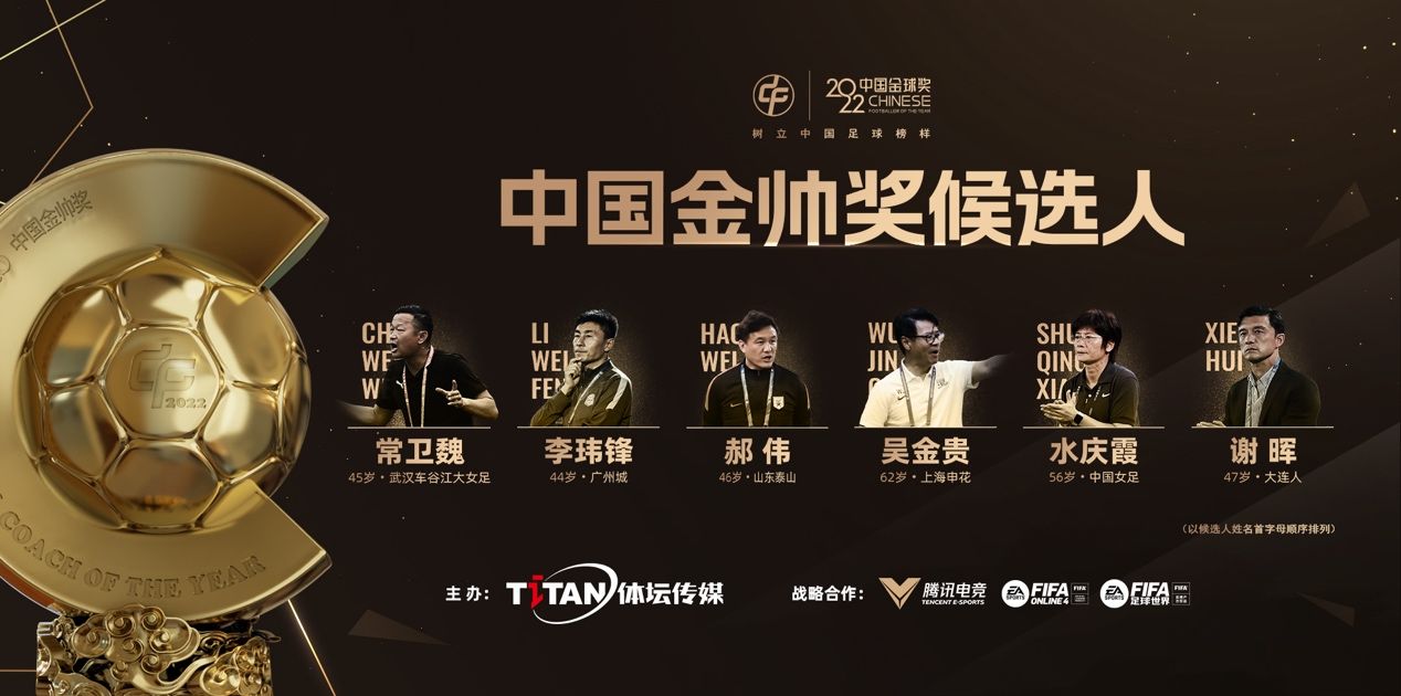 中国金帅奖授予年度表现最佳的中国籍教练员。在2022的候选名单中,出现了3位上海教练,占据了候选者的“半壁江山”:水庆霞年初率领中国女足夺得亚洲杯冠军,人气飞涨;吴金贵在接手上海申花后,主动扛下困难和责任,用丰富的经验帮助球队度过难关,并在联赛中给予年轻队员很多的锻炼机会;谢晖职业生涯首次以主教练的身份征战中超联赛,在率领大连人完成保级任务的同时,以一股清流般的足球理念和独特气质征服了广大球迷。2022赛季同样在教练席上有着惊艳表现的还有李玮锋,他赛季中途上任,临危受命率领广州城成功保级。他带给广州城的改变不止于场内的技战术,更在于更衣室的管理与团队凝聚力的提升。2020和2021两年的中国金帅奖得主郝伟,率领阵容不整的山东泰山在本赛季联赛和足协杯战场双线进发,且均坚持到最后,成绩仍值得肯定。而在女足方面,武汉车谷江大轻松卫冕女超冠军,主帅常卫魏居功至伟。这两位教头入围2022中国金帅奖候选名单也是实至名归。
