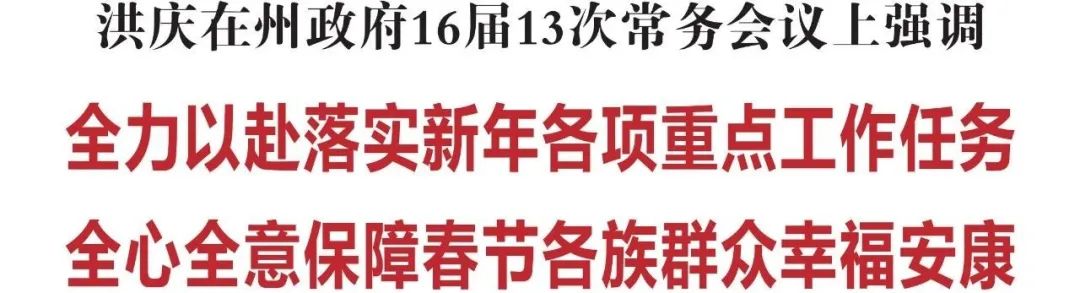1月14日,州委副书记、州长洪庆主持召开州政府16届13次常务会议,听取《政府工作报告》任务分解、2023年经济发展指标预期、春节和“两会”期间安全生产、全州新冠病毒感染防治、节日保供情况汇报;审议并原则通过了《延边州经济高质量发展“赛马”机制实施方案》《2023年延边州民生实事安排意见》《延边州“十四五”城乡社区服务体系建设规划》《关于全面推进农村供水和污水处理设施建设工程总体方案》,决定分别按照程序报告、提请审定或备案。