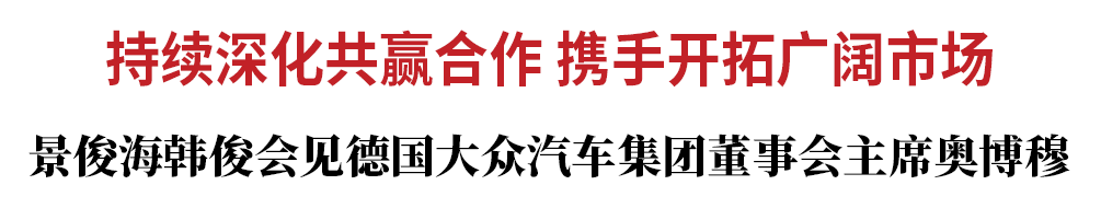 景俊海、韩俊向奥博穆一行表示热烈欢迎。景俊海说,三十多年来,吉林省、中国一汽与德国大众开展了深度合作、取得了巨大成功,堪称中德合作的典范。习近平总书记十分关心吉林省和中国一汽发展并寄予厚望。我们始终牢记习近平总书记殷殷嘱托,举全省之力支持一汽创建世界一流企业,大力实施汽车产业集群“上台阶”工程,推动吉林汽车产业向着万亿级规模迈进。希望德国大众与我们一起把握吉林全面振兴蓄势待发的时代机遇,持续深化共赢合作,支持推动奥迪一汽新能源汽车等重大项目尽快投产达效,引入更多先进技术和优质车型,引导更多配套企业落户吉林,助力我省打造新能源汽车全产业链条,携手开拓更加广阔市场。