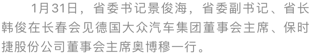1月31日,省委书记景俊海,省委副书记、省长韩俊在长春会见德国大众汽车集团董事会主席、保时捷股份公司董事会主席奥博穆一行。