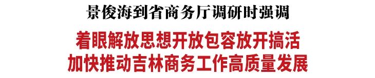 调研中,景俊海充分肯定全省商务工作并强调,全省商务系统要聚焦“一主六双”高质量发展战略,扎实做好促进消费、招商引资、发展贸易、对外开放等各项工作,助力经济运行整体好转。一要全力以赴聚人气、增活力、促消费,聚焦“六新产业”和“四新设施”,用好用活相关政策,采取针对性举措,有效拉动消费增长、稳住经济大盘。二要多措并举强招商、引企业、落项目,聚焦优势产业发展和重大项目建设,主动加强与京津冀、长江经济带、粤港澳大湾区等重点区域对接合作,努力引进更多投资者、总部基地、研发中心、孵化平台,加快推进产业集群化、规模化发展;深化商事制度改革,推动流程再造、功能完善、服务提升,帮助企业解决实际困难,让国企敢干、民企敢闯、外企敢投,形成大企业“顶天立地”、中小企业“万马奔腾”、小微企业“生龙活虎”的生动局面。三要千方百计挖潜力、扩增量、稳外贸,大力发展跨境电商、外贸综合服务、市场采购贸易,增强优势产业外向度和特色产品竞争力,进一步扩大外贸规模,不断提升贸易投资合作质量和水平。四要坚定不移扩开放、促合作、助发展,继续发挥“一带一路”向北开放重要窗口作用,纵深推进“五个合作”,提升长春新区、珲春海洋经济发展示范区等重点开放平台功能,支持各级各类开发区加快改革突破、制度创新,更好激活内部、聚焦周边、对接全国、深耕东北亚、联结全世界,为建设更高水平开放型经济体系奠定坚实基础。省委将一如既往重视支持商务工作,努力为大家履职尽责、开展工作创造良好条件。