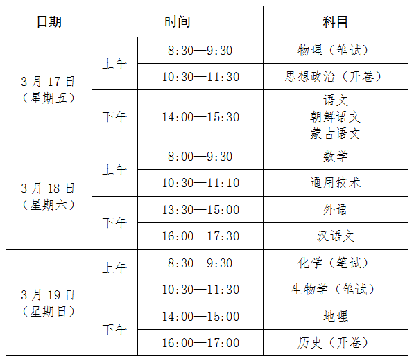 经研究决定,2022年下半年我省普通高中学业水平合格性考试时间调整至2023年3月17日—19日进行,具体考试时间安排如下: