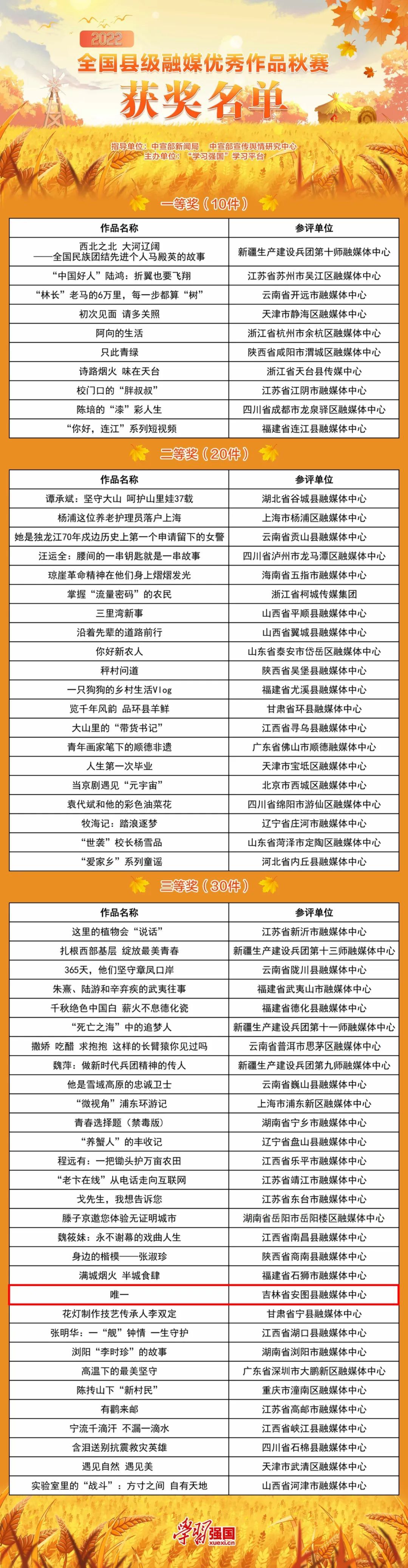 近日,由中宣部新闻局、中宣部宣传舆情研究中心指导,“学习强国”学习平台主办,各省(区、市)和新疆生产建设兵团学习平台协助组织、共同实施的2022年全国县级融媒体中心优秀作品秋赛获奖作品揭晓。各省级学习平台对投稿作品进行初评,评选出301件优秀作品。“学习强国”学习平台组织专家评审团队对优秀作品进行复评、终评,最终评选出60件获奖作品。其中,《西北之北 大河辽阔——全国民族团结先进个人马殿英的故事》《“中国好人”陆鸿:折翼也要飞翔》《“林长”老马的6万里,每一步都算“树”》《初次见面 请多关照》《阿向的生活》《只此青绿》《诗路烟火 味在天台》《校门口的“胖叔叔”》《陈培的“漆”彩人生》《“你好,连江”系列短视频》10件作品被评为一等奖;《谭承斌:坚守大山 呵护山里娃37载》等20件作品被评为二等奖;《这里的植物会“说话”》等30件作品被评为三等奖。其中,安图县融媒体中心的作品《唯一》荣获三等奖。