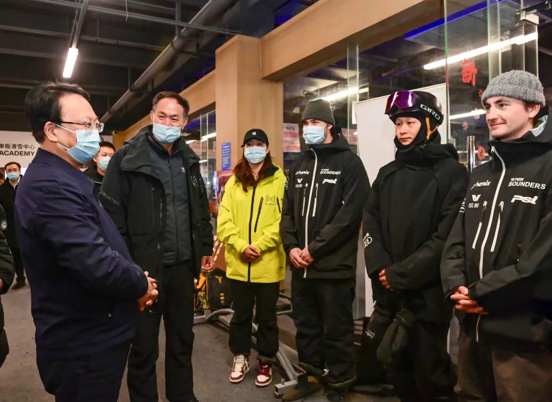 2月14日,省委书记景俊海到吉林市调研指导冰雪强省建设工作,在北大湖滑雪度假区与爱好者亲切交流。