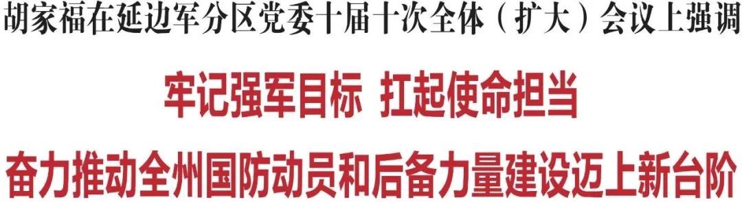 胡家福强调,今年是全面贯彻落实党的二十大精神的开局之年,也是确保实现建军一百年奋斗目标的关键之年,党、国家和军队大事多、要事多,扎实推进国防和军队现代化建设至关重要。军分区各级要坚决贯彻新时代军事战略方针,高举旗帜铸牢军魂,紧盯强敌练兵备战,着眼长远夯实根基,始终保持“时时放心不下”的责任感和“箭在弦上”的战备状态,为推动延边跨越赶超、确保边疆长治久安作出新的更大贡献。一要突出抓好政治建军,自觉用习近平强军思想凝心铸魂。军分区各级要始终把政治建军作为立军之本,强化党的创新理论武装,扎实开展军委主席负责制学习教育,积极组织“学习强军思想、建功强军事业”教育实践活动,推进政治整训常态化制度化,教育引导广大官兵深刻领悟“两个确立”的决定性意义,切实把忠诚核心、拥戴核心、维护核心、捍卫核心融入官兵血脉灵魂,确保绝对忠诚、绝对纯洁、绝对可靠。二要聚焦聚力练兵备战,做深做细做实国防动员各项准备。军分区各级要强化忧患意识、危机意识、打仗意识,着力提升国防动员指挥能力,探索兵员征集新路,深入推进实战化军事训练,深化联合训练、对抗训练、科技练兵,锻造召之即来、来之能战、战之必胜的精兵劲旅。三要坚持军地同向发力,巩固发展新时代军民团结良好局面。各级党委要严格落实党管武装制度,广泛开展全民国防教育,积极拓展“优先、优抚、优待”措施,着力破解“后路、后院、后代”难题,真正做到抓经济不忘固国防、搞建设不忘兴武装、守平安不忘强备战。军分区要充分发挥军地衔接的“桥梁”、“纽带”作用,带领驻延部队热爱延边、扎根延边、奉献延边,继续在稳边固防、抢险救灾、乡村振兴等任务中发挥生力军、排头兵、突击队作用,为推动延边振兴发展助力加油、贡献力量。
