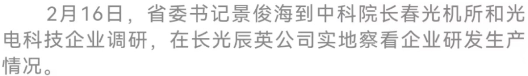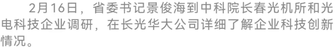 2月16日,省委书记景俊海到中科院长春光机所和光电科技企业调研。他强调,要深入贯彻习近平总书记关于科技创新的重要论述,聚焦党的二十大确定的各项目标任务, 积极投身吉林振兴发展实践,进一步激发创新热情、鼓足创业干劲、增强创造活力,在实现高水平科技自立自强中彰显使命担当。