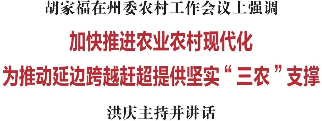 2月22日,州委农村工作会议在延吉召开。省委常委、州委书记胡家福出席会议并讲话。他强调,要深入贯彻党的二十大精神和中央农村工作会议、省委农村工作会议精神,聚焦建设农业强国、农业强省重大战略任务,以更加强烈的政治担当、更加有力的政策举措,加快推进农业农村现代化,为推动延边跨越赶超提供坚实“三农”支撑。州委副书记、州长洪庆主持会议并讲话。