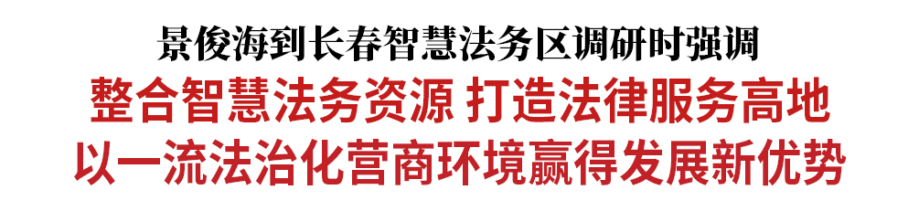 调研中,景俊海主持召开座谈会,听取长春智慧法务区建设运行情况,与法律服务企业负责人深入交流。他强调,推动长春智慧法务区高质量发展,必须坚持专业化、集约化、智能化、国际化发展方向,进一步出政策、汇资源、引项目、聚人才、增活力。一要深度融入吉林全面振兴大局,聚焦“一主六双”高质量发展战略,围绕发展壮大现代法律服务业持续发力,推动智慧法务区优化功能、补链强链,进一步完善公共法律服务网络,为广大群众和各类市场主体提供优质高效服务。二要加速释放智慧法务区活力动力,坚持以“放”为先、以“放”促活、以“放”育机,拿出具有竞争力、吸引力的政策措施,尽快落户一批法律服务头部企业,引进培育一批高端法务人才,孵化一批与税务、会计、审计等法律服务关联密切的产业,促进现代法律服务业集群集聚。三要加快打造高能级法务生态体系,强化平台支撑,完善配套设施,推动法务项目、产业、人才、创新全要素汇聚,法务核心产业、关联产业、衍生配套产业全链条贯通。四要扎实抓好各项任务落地落实,进一步强化组织领导、统筹协作、跟踪问效,用好“五化”闭环工作法,推动长春智慧法务区建设取得新的更大成效。