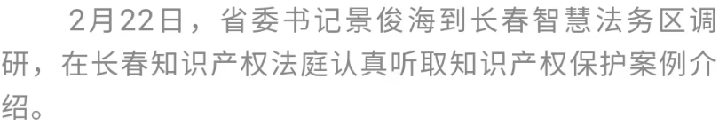 景俊海来到长春知识产权运营服务平台,实地察看运行情况,详细了解长春知识产权生态小镇建设规划。他强调,保护知识产权就是保护创新。要聚焦新经济新业态新模式,创新知识产权服务,尽快构建全方位知识产权保护体系,努力营造一流的创新创业创造环境。长春知识产权法庭是东北地区首家知识产权法庭。景俊海认真听取知识产权保护案例介绍,要求在严厉打击侵犯知识产权违法行为的同时,大力宣传普及知识产权保护有关法律,进一步增强群众尊重保护知识产权的法治意识。在长春互联网法庭,景俊海现场观摩互联网审判流程,鼓励审判人员主动把握新趋势、探索新机制、用好新形态,持续提高审判质量效率。