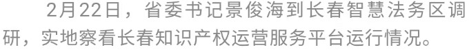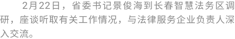 2月22日,省委书记景俊海到长春智慧法务区调研。他强调,要深入贯彻习近平法治思想和习近平总书记视察吉林重要讲话重要指示精神,进一步解放思想、开放包容、放开搞活,坚持立足吉林、服务东北、面向全国、辐射东北亚,整合智慧法务资源,打造法律服务高地,以一流法治化营商环境赢得发展新优势,为推动吉林全面振兴注入强劲动能。