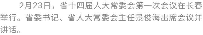 2月23日,省十四届人大常委会第一次会议在长春举行。省委书记、省人大常委会主任景俊海出席会议并讲话。