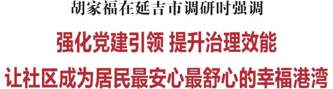 调研中,胡家福强调,社区是维护社会稳定的第一防线,是服务群众的第一平台,是展示党和政府形象的第一窗口。全州各街道、各乡镇要着力提升社区治理效能,不断提高社区现代化建设水平,让生活在延边的群众更安心、更舒心、更暖心。要坚持党建引领,推动社区党建与社会治理深度融合、同频共振,着力健全社区治理机制,加强社区服务人才队伍建设,为实现社区高效能治理、高水平服务提供有力支撑。要提升自治能力,坚持和发展新时代“枫桥经验”,完善多方联动机制,创新居民参与方式,搭好居民议事平台,进一步畅通和规范群众诉求表达通道,及时把矛盾纠纷化解在基层、化解在萌芽状态。要擦亮为民底色,精准对接群众需求,提供更多惠民生、暖民心举措,用心用情用力解决好群众身边的操心事、烦心事、揪心事,让各族群众有更多归属感、认同感和幸福感。