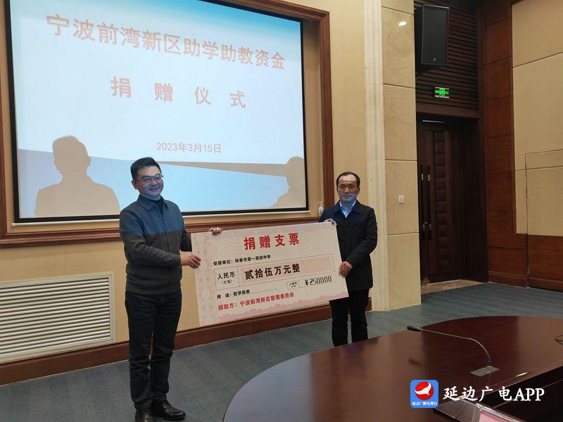 3月15日,宁波前湾新区助学助教资金捐赠仪式在延吉举行,仪式现场宁波前湾新区向珲春市第一高级中学、和龙市第二实验小学分别捐赠25万元助学助教金。